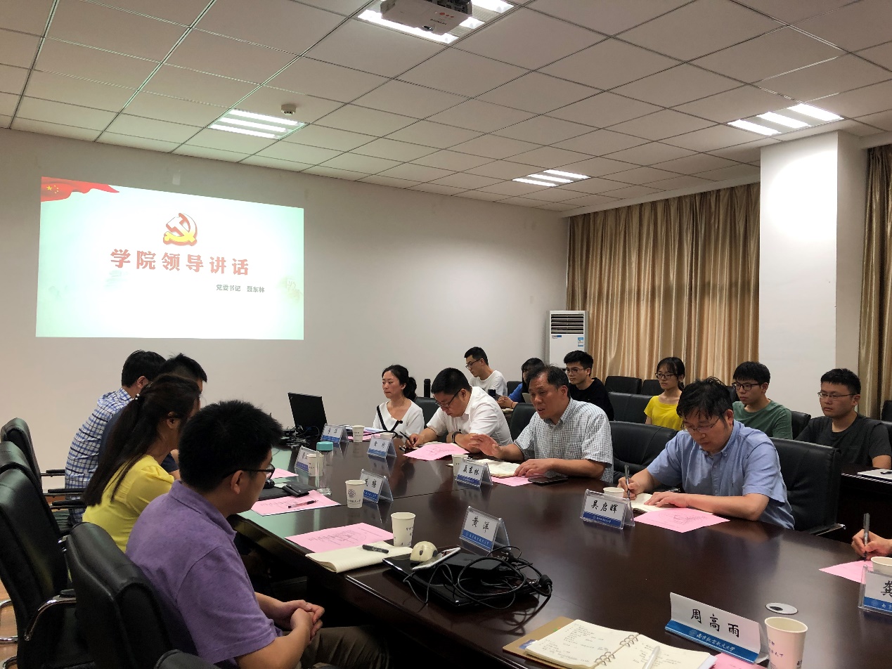 然后,学院党委书记聂东林老师代表学院对我室研究生党支部的成立表示祝贺,再次强调了纵向党支部的优势,同时也对吴启晖院长提出的指示表示了肯定,他还强调了基层党支部的重要性,为支部成员们送上了亲切的寄语,希望每一位党员都能成为讲政治的带头人和捍卫者,促进科研和党建更好的融合。