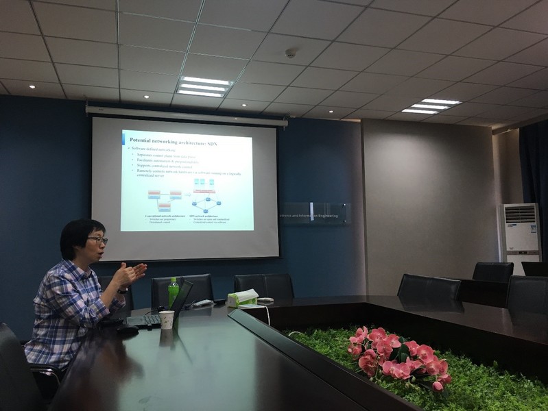 在交流过程中,吴启晖教授向庄卫华院士介绍了我室团队构成及我室学术及科研近况。我室各研究小组代表也向庄院士介绍了我室在无人机频谱监测、抗干扰频谱管控链、车联网智能频谱协作、大数据频谱态势预测、太赫兹成像、电磁频谱博弈对抗等方面的研究工作。随后,庄卫华院士做了题为《Service Provisioning in 5G Communication Networks》的学术报告,介绍了加拿大滑铁卢大学研究团队在5G核心网网络功能虚拟化、软件定义网络方面的近期研究进展及成果。报告结束后,在吴启晖教授的主持下,我室师生代表与庄卫华院士就报告内容及相关研究方向展开热烈的学术讨论。
