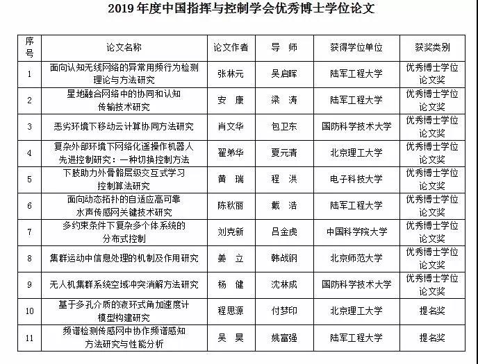 为推动我国指挥控制领域的科技进步,鼓励领域内博士研究生潜心钻研,开拓创新,表彰取得优秀成果的年轻学者,依据“中国指挥与控制学会科学技术奖”的有关条例,中国指挥与控制学会经资格审查、评审和终评三个阶段,授予9篇博士论文“优秀博士学位论文奖”,授予2篇博士论文“提名奖”。其中,我室吴启晖教授指导的学生张林元同学撰写的论文:“面向认知无线网络的异常用频行为检测理论与方法研究”获得“优秀博士学位论文奖”。