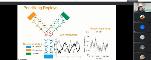 在报告中,柳昀哲研究员指出可以利用强化学习与无创功能脑磁图技术相结合,证明神经活动重现是线下学习的神经机制,并解决如何通过神经活动重现来促进灵活决策,即使用当前的经验来指导未来的决策的问题。这就涉及到一个直接学习(顺序神经活动重现)与间接学习(逆序神经活动重现)的问题。间接经验学习根据认知图谱进行推论学习,不需要直接经历奖赏,当奖赏信息发生变化时,大脑出现了促使间接经验学习的神经活动重现。