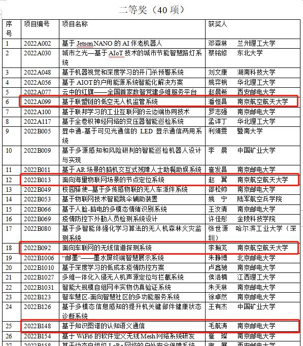 8月26日,由中国通信学会和中国电子学会主办的第八届3S杯大学生物联网技术与应用“三创”大赛决赛在南京举办,我室基于联盟链的低空无人机管理系统、面向海量物联网场景的节点定位系统、面向车联网的无线信道探测系统以及与南京邮电大学合作项目基于知识图谱的认知语义通信等多个项目荣获二等奖。