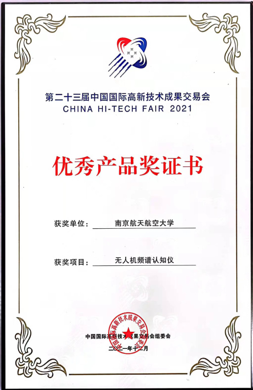2021年11月17日-21日,第二十三届中国国际高新技术成果交易会在深圳会展中心(福田)举行,本次大会上,我室“无人机频谱认知仪(A UAV-Based Spectrum Cognition Instrument)”项目荣获优秀产品奖。中国国际高新技术成果交易会是经国务院批准举办的高新技术成果展示与交易的专业展会。高交会由多家政府部门、科研单位和深圳市人民政府共同主办。本次大会有近千家新技术企业、高校及科研院所、重点实验室等展商展示他们的研究成果,涵盖电子与信息、生物医药及医疗器械等多个领域,部分核心技术获得过中国专利金奖、专利优秀奖等奖项,知识产权优势显著。
