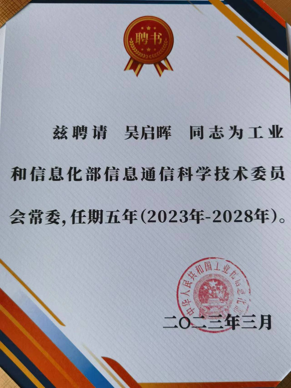 此次大会上,有关专家院士围绕数字经济发展、信息通信技术创新作了主旨演讲,同时,会议听取第二届科技委工作报告和新一届科技委工作考虑,宣布了第三届科技委组成人员名单并颁发聘书。其中,我室吴启晖教授被聘请为工业和信息化部通信科学技术委员会常任委员,并受聘为无线电频率专家咨询组委员。