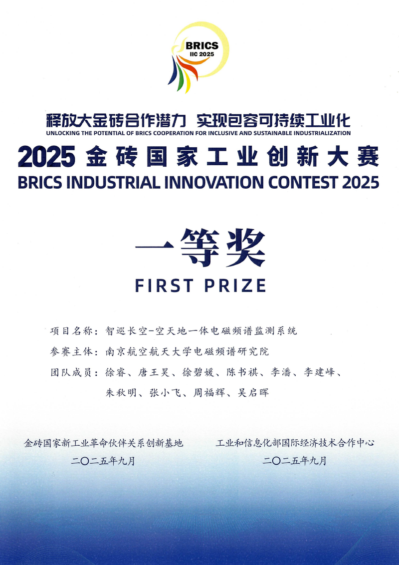2025年9月11日至12日,2025金砖国家工业创新大赛决赛在厦门以路演答辩形式开展,我室徐睿博士、唐王昊博士、徐碧媛硕士组成的智巡长空团队携“智巡长空——空天地一体电磁频谱监测系统”项目荣获低空装备产业赛道一等奖,指导老师为李建峰教授、朱秋明教授、张小飞教授、周福辉教授、吴启晖教授。
