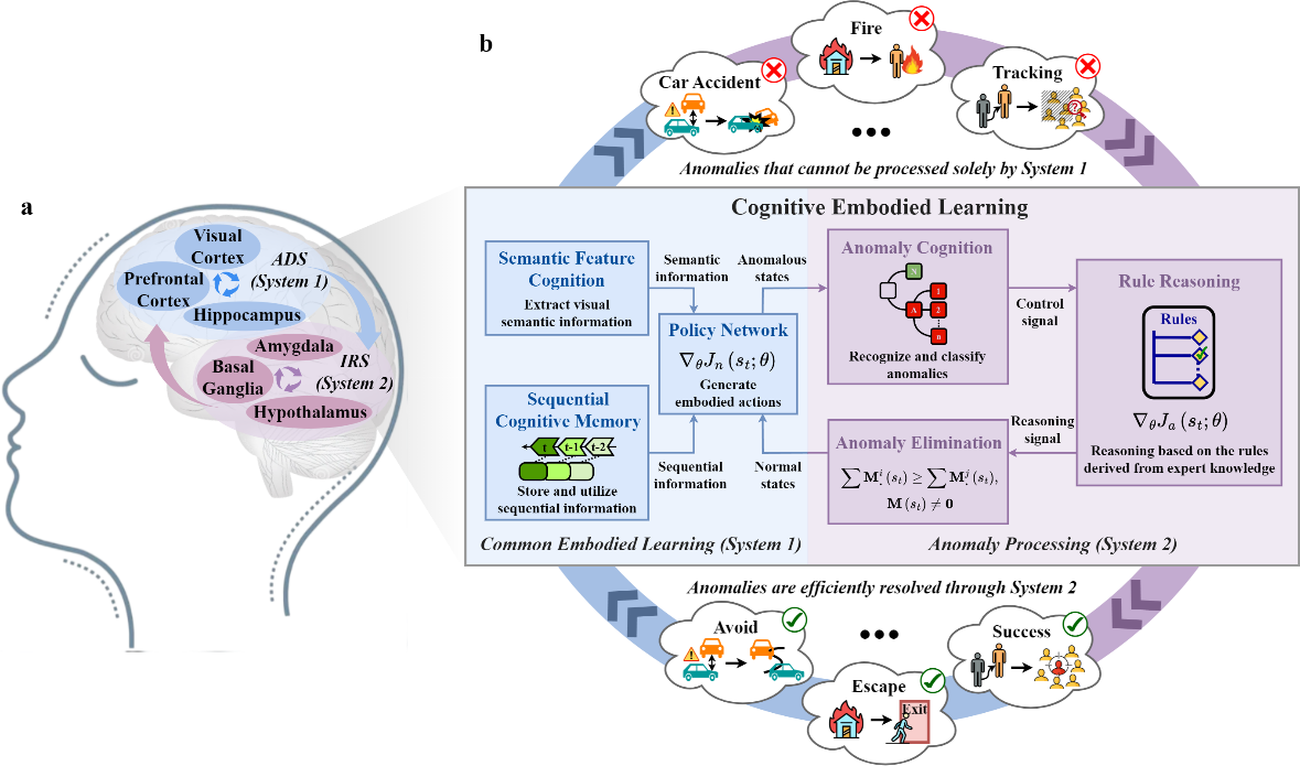 本研究受诺贝尔经济学奖得主丹尼尔·卡尼曼提出的“人脑双决策系统”理论启发,创新性地提出了一种认知具身学习(Cognitive Embodied Learning, CEL)-具身智能新范式。该范式模拟人脑在常规与紧急状态下切换不同决策模式的能力,使智能体能够鲁棒、高效地应对复杂环境中的突发严重异常挑战,丰富了我室提出的认知决策环理论。