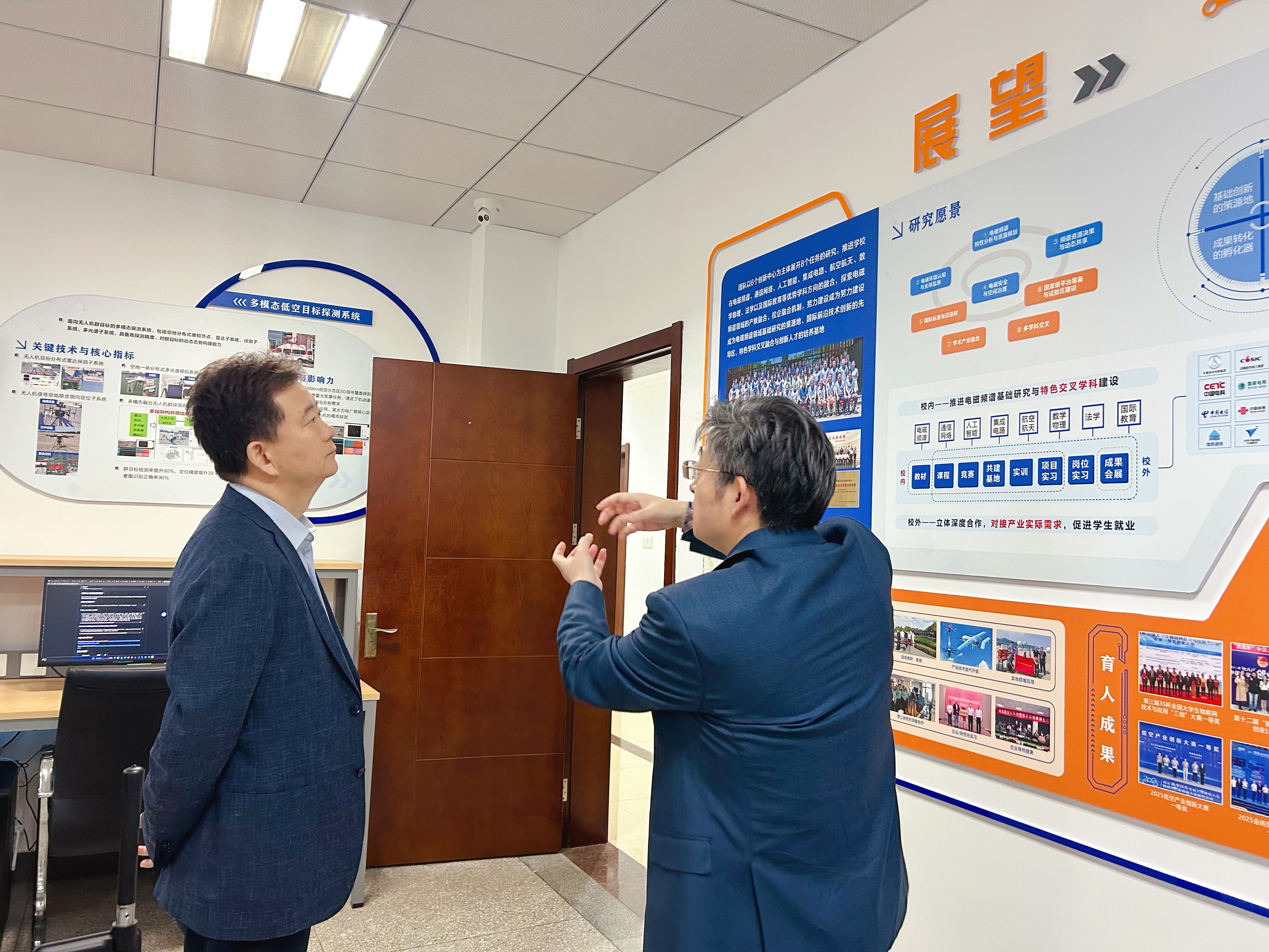 20251014日下午,江苏省工业和信息化厅副厅长、党组成员石晓鹏率队莅临南京航空航天大学电磁频谱研究院调研指导工作。省工信厅无线电管理局局长金雷、省无线电监测站站长冯苏祥、省工信厅无线电管理局副局长王印等陪同调研,我校党委常委、副校长吴启晖、电磁频谱研究院副院长董超、低空经济创新发展研究院办公室主任孙明智及研究院各创新中心负责人全程陪同并汇报工作。