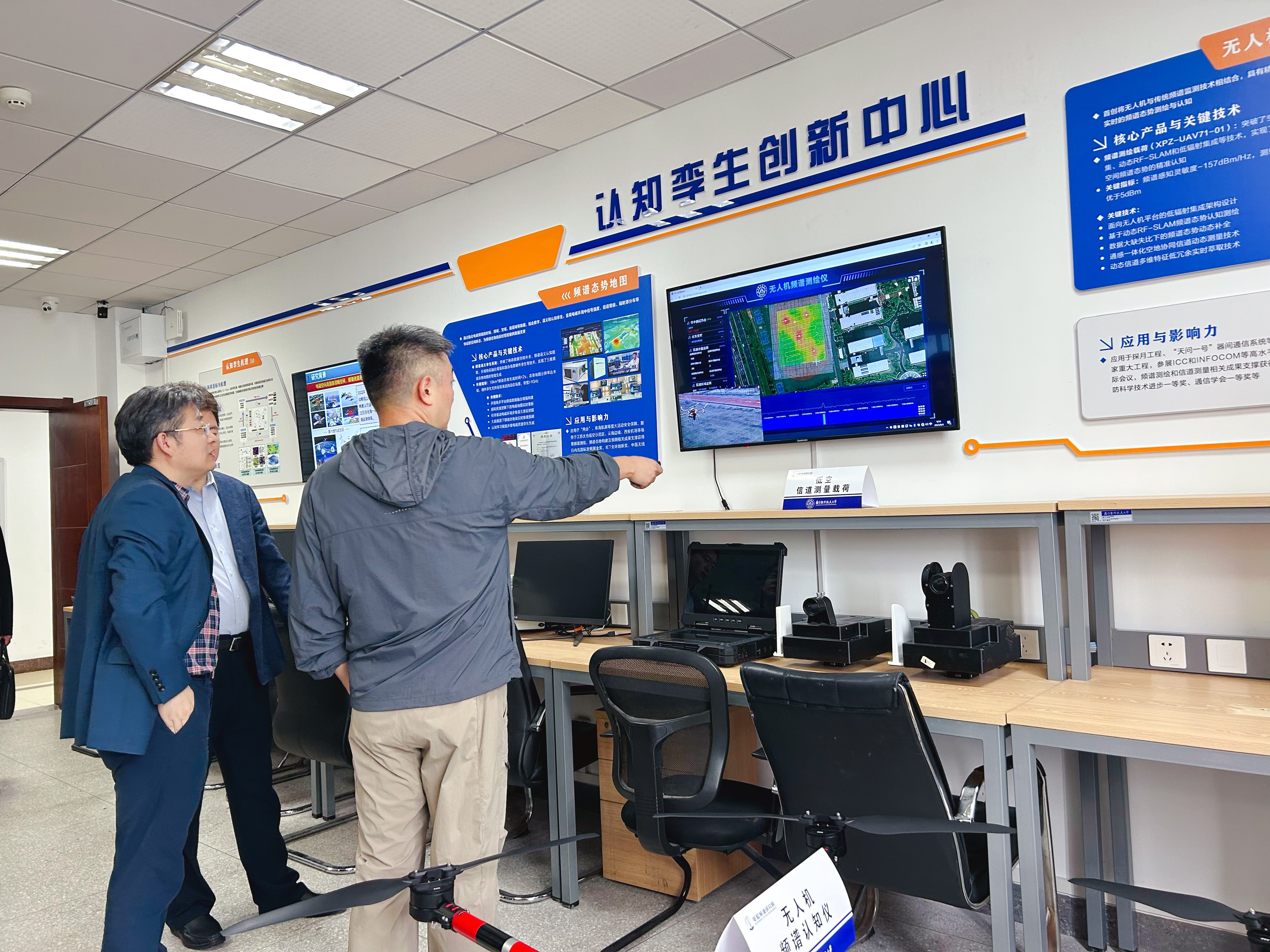 调研团队实地走访了研究院的创新实验室,系统考察从基础理论到应用落地的全链条创新成果。吴启晖副校长在总体介绍中指出,团队组建于2016年,坚持航空、航天、民航与国防特色,以认知智能为核心、电磁频谱空间与天地一体化网络为两翼,始终面向“复杂电磁频谱环境下的高效快速认知决策闭环”问题展开研究,团队目前下设认知智能、认知安全、认知网络、认知射频、认知孪生与认知定位共6个创新中心与1个研发工程中心、1个战略指导中心。
