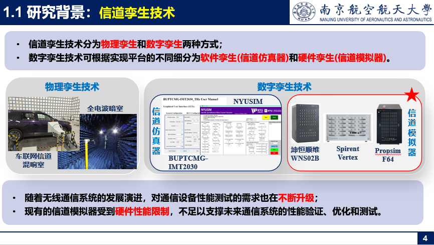 无线信道作为通信系统的核心载体,其传输特性直接制约通信系统的性能指标与应用效能。信道孪生技术通过物理建模或数字仿真方式精确复现信道对信号传播的失真效应,为通信系统的性能评估与优化提供了高效测试验证手段。其中,数字孪生方式更为灵活方便,特别是无线信道硬件孪生平台已广泛应用于通信设备的批量化测试。然而,随着通信系统向大带宽、高动态和大规模网络发展,现有无线信道硬件孪生技术难以满足未来系统性能验证需求。该论文系统综述了无线信道硬件孪生技术的国内外研究现状,从技术架构、实现方法及性能指标等维度进行分类对比分析,深入剖析当前技术瓶颈,并结合新兴技术提出了面向未来的技术突破方向与潜在应用场景。