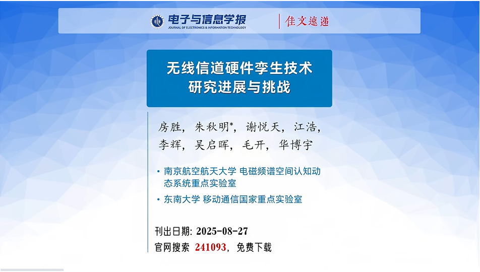 《电子与信息学报》是国内电子信息领域具有重要学术影响力的核心期刊,长期聚焦电子信息领域的前沿理论研究与关键技术突破,是中国科技期刊卓越行动计划“中文领军期刊”,同时入选中国计算机学会(CCF)推荐期刊计算领域高质量科技期刊分级目录(2025)T1类。其设立的“融媒体佳文速递”专栏,旨在遴选发表具有重大理论创新价值、前沿技术引领作用及明确应用前景的优秀学术成果,是领域内学术研究与技术转化的重要交流平台。