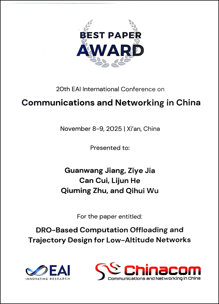 2025年11月8日,20th EAI International Conference on Communications and Networking in China(EAI Chinacom 2025)国际会议公布了2025年最佳论文奖入选名单,我室姜官旺、贾子晔副教授、崔灿、朱秋明教授和吴启晖教授等人撰写的题为《DRO-Based Computation Offloading and Trajectory Design for Low-Altitude Networks》的论文成功入选。本次大会共录取47篇论文,经专题技术委员会评审和推荐,最终评选出4篇最佳论文(Best Paper),获奖率为8.5%。该论文的入选凸显我室重视培养具有扎实专业知识基础、创新能力强的高素质人才,反映出我室在信息通信领域的研究取得了具有国际影响力的学术成果,也是我室一直重视面向国家战略需求、面向世界科技前沿等科技创新的重要体现。