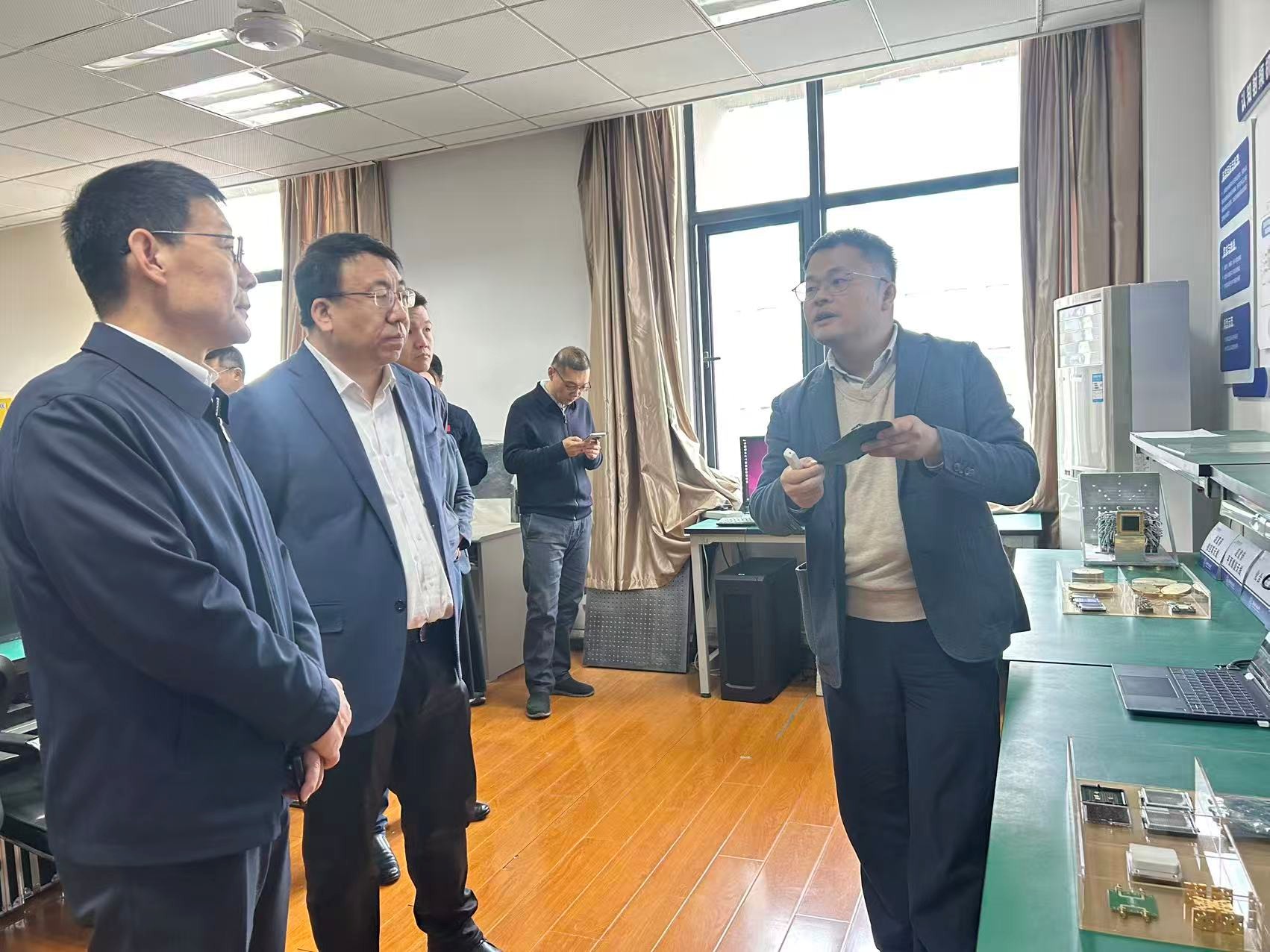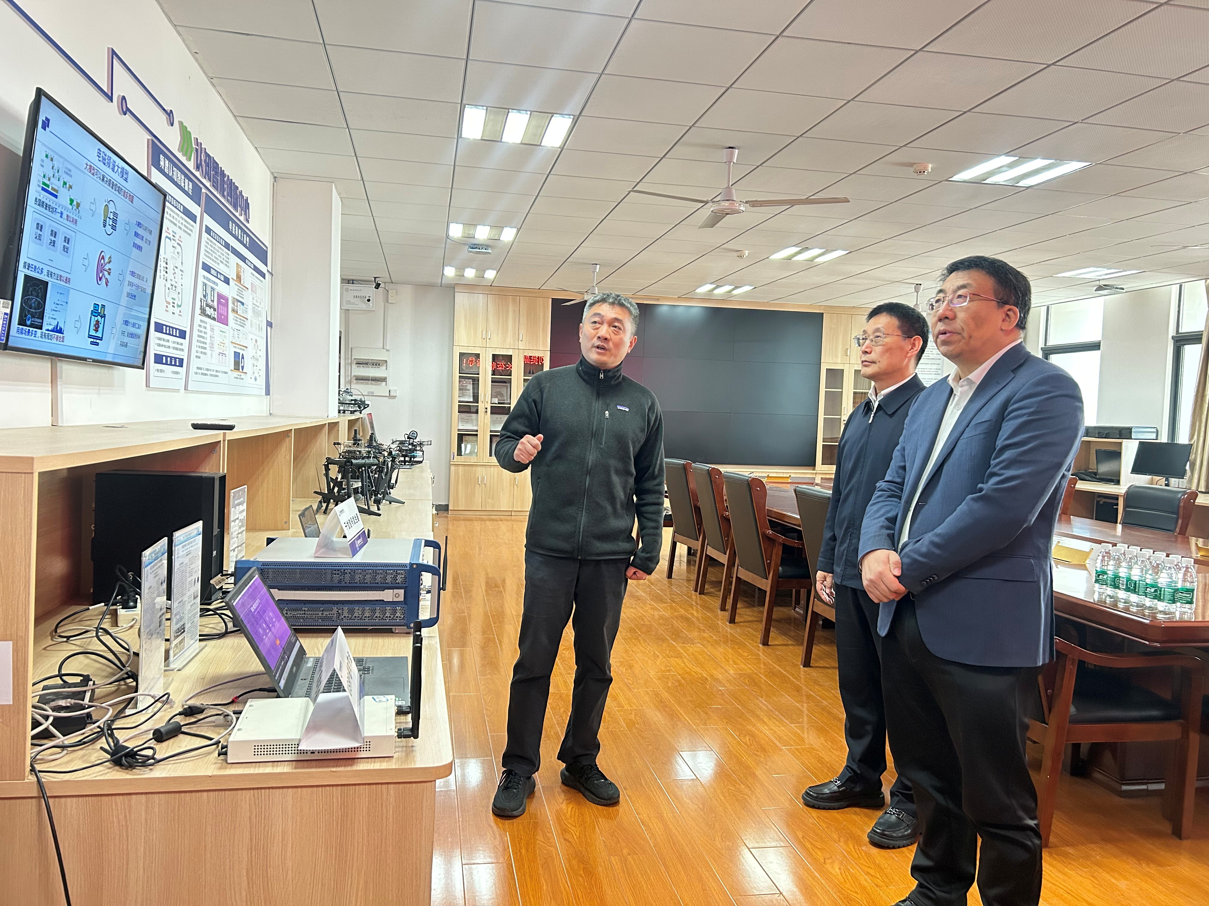 调研过程中,董超介绍了电磁频谱研究院总体情况,重点阐述了研究院的定位、研究特色方向研究主题,同时介绍了研究院在人才梯队建设、关键技术科研创新与成果产业化转化等方面取得的阶段性建设成效。随后,董超、施永荣与叶方伟分依次详细介绍了研究院六个创新中心在各自研究方向上的技术突破与应用成果。
